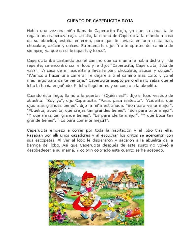 Te descubrimos el cuento original de la Caperucita Roja. Caperucita Roja tiró de la. No conocemos cómo se llama ni el nombre de quien escribió la historia original de caperucita roja. Por último publicamos una rareza la versión dramática y en verso que el gran escritor alemán Ludwig. Siempre se ha dicho que la idea fue de Charles Perrault que escribió el cuento en el siglo XVII. En 1812 los hermanos Grimm retomaron el cuento y escribieron una nueva versión que fue la que hizo que Caperucita fuera conocida casi universalmente y que aún hoy en día es la más leída. Caperucita Roja es una historia popular fruto de la inventiva de no sé sabe quién y transmitida durante siglos de padres a hijos en la vieja Europa. Caperucita Roja es un clásico cuento infantil que goza de fama en muchos países del mundo. El autor elimina la palabra mejor y en lugar de comer dice comerte.